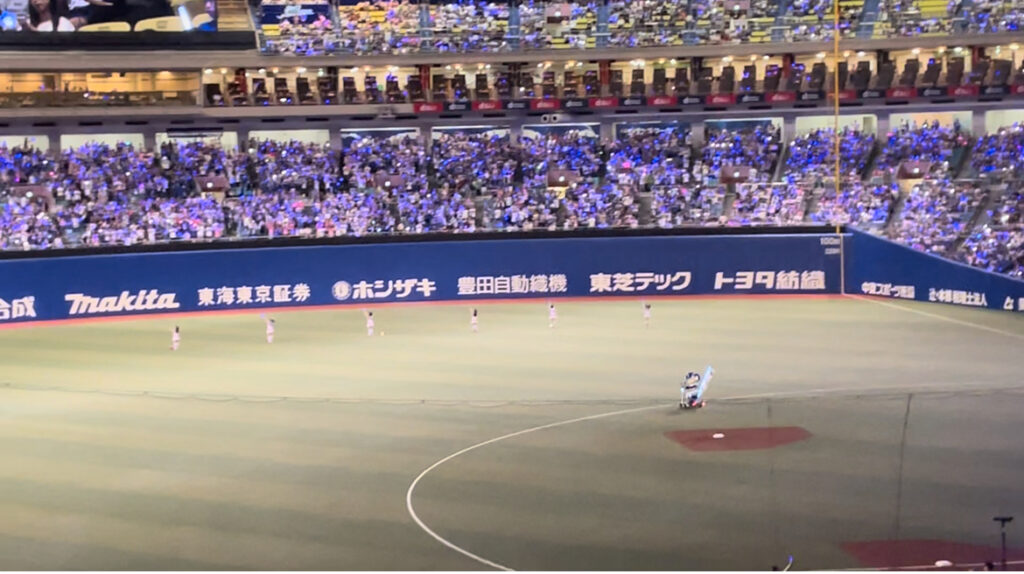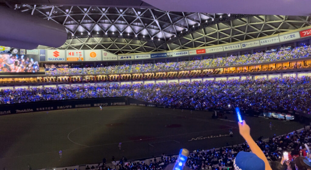 照明が落ちた中で青い光がゆらめく光景は、本当に感動的で、現地でしか味わえない“ドラゴンズファンとしての至福の瞬間”でした。